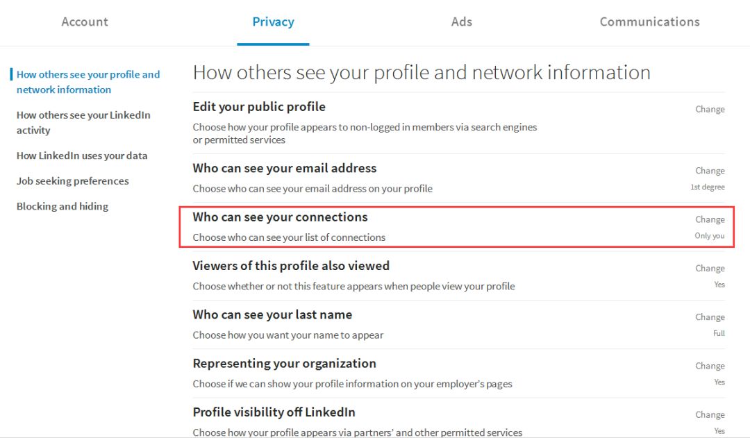 大部分中国的领英用户群体都是做外贸的,那么就难免会担心自己的同行竞争对手会盯着自己的领英帐号做文章,挖墙脚。首先我们就要学会进行自我保护设置,分别在Settings & Privacy和Edit public profile & URL里进行自定义的隐私设置:
